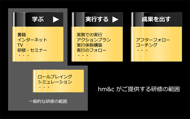 hm&cでは、研修の中に限りなく御社の実務に近い形での題材を取り込み、実際に実務での課題を解決しながら研修を行っていくことで、「成果を出しながら学習する」というコンセプトを実現します。
